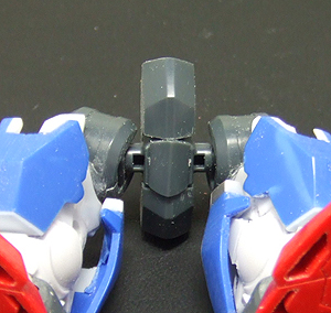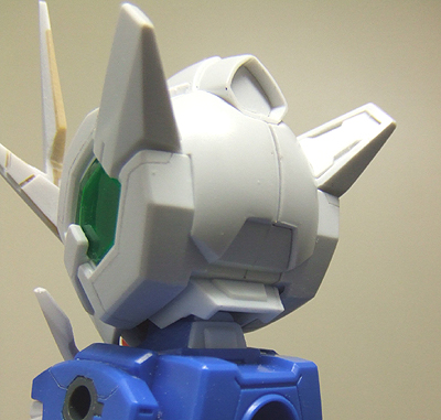 リアはTの字の形状をHGのクアンタに近づけるためにV字に近いフォルムに形状変更。取りつけ位置を少し上方に持っていき赤い腰パーツとの隙間が見えなくしました。