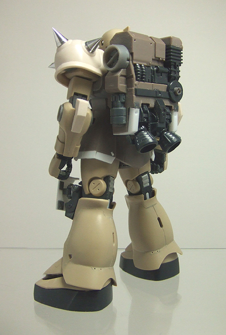 ・とにかくゴツくを念頭に、まず小さすぎるバーニアを何とかしようとランドセル下から1/3を削除して、MGザクのランドセルからバーニアまでを(内部パーツのみ)調整や新たなディテも追加して設置。一部メカが露出した迫力あるランドセルになりました。その他、ツインサークルやらジャンクパーツなどで寂しい部分にディテ追加しています。