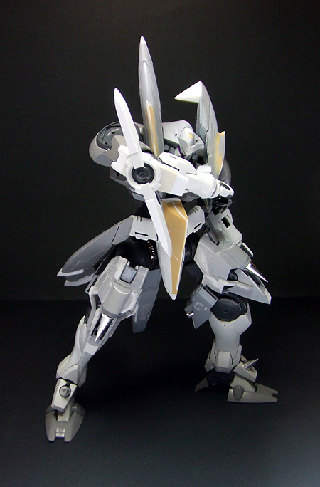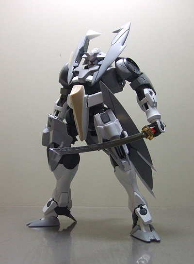 とりあえずブシドーと言えば近距離戦が中心になると思うので各部にスパイクを追加。驚異的な機動力確保のためには非GN装備であるスパイクやクローや実剣が装備の中心だったと思うのです。キャノン的なものはあくまで補助だと考えたので、今回手持ちのライフルも含めて頭部バルカン以外は排除しました。