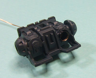 モノアイ基部のパーツの正面に直径2ミリの穴をあけて、下から垂直に1ミリの穴を貫通させます。
